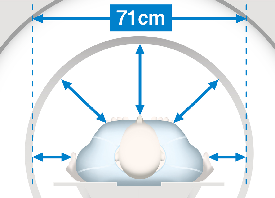 開口径が71cm(国内最大径)まで広がっているため、体の大きな方や閉所恐怖症の方も、広くて閉塞感の少ない検査スペースでリラックスして検査を受けて頂けます。